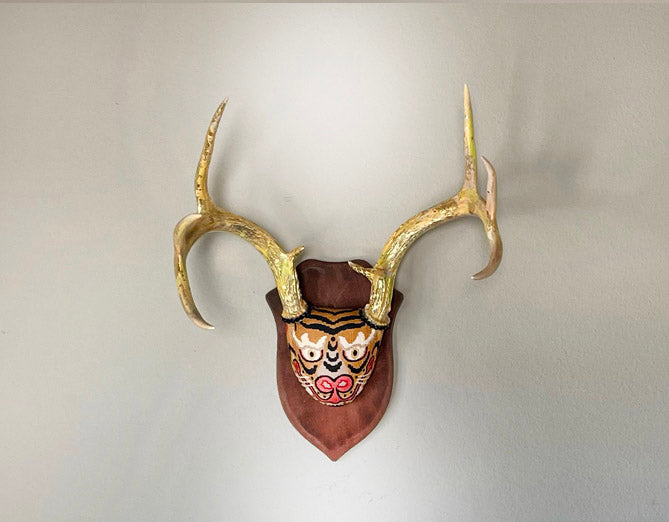 Gold foiled 9 point mounted real whitetail deer antlers covered in Chinese tiger print fabric with black rhinestone details. It's Far East, solid gold. These antlers are almost vintage... more than 10 years old and in very good condition, with a couple of dings from life in the wild and one extra (abnormal) tine on it's left side which is rare and charming. This piece is really interesting and sure to draw attention and start conversations!