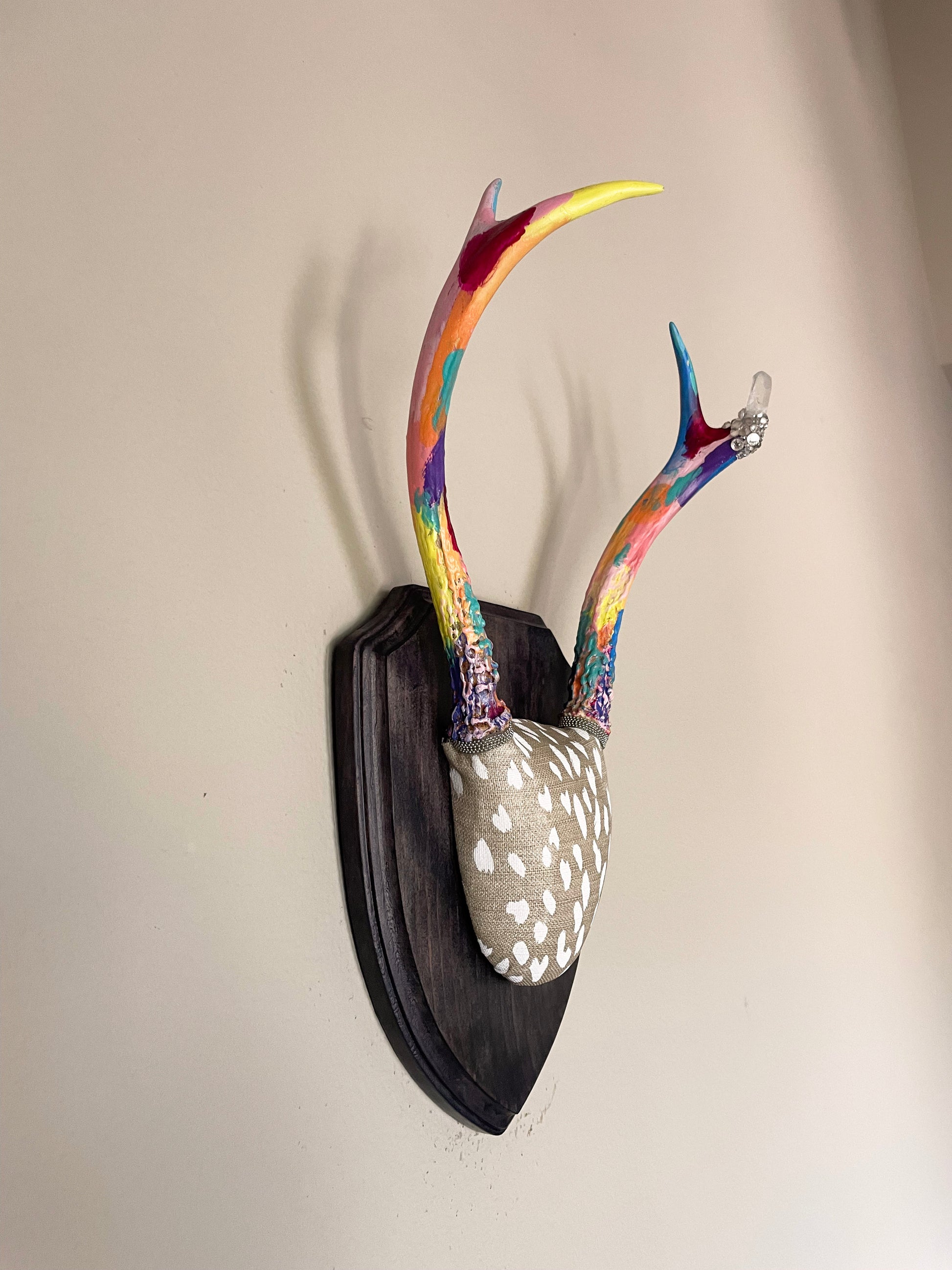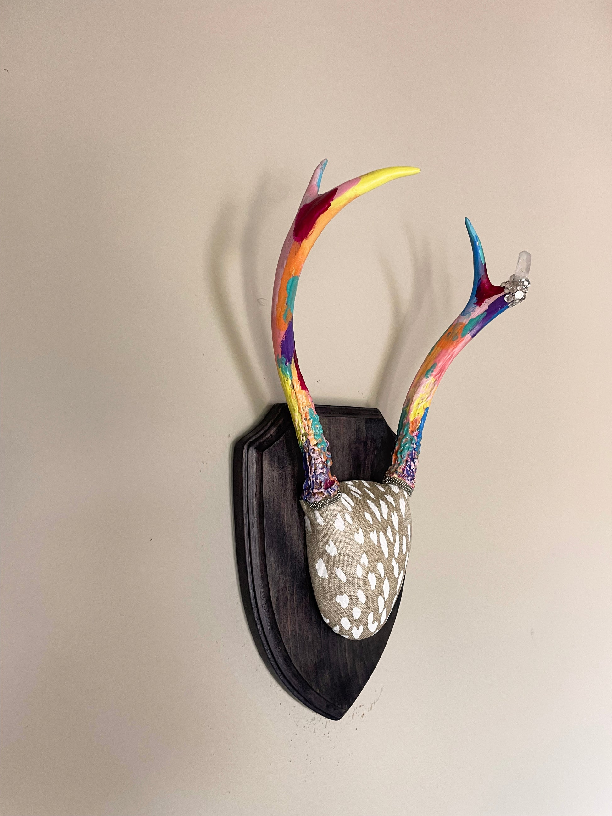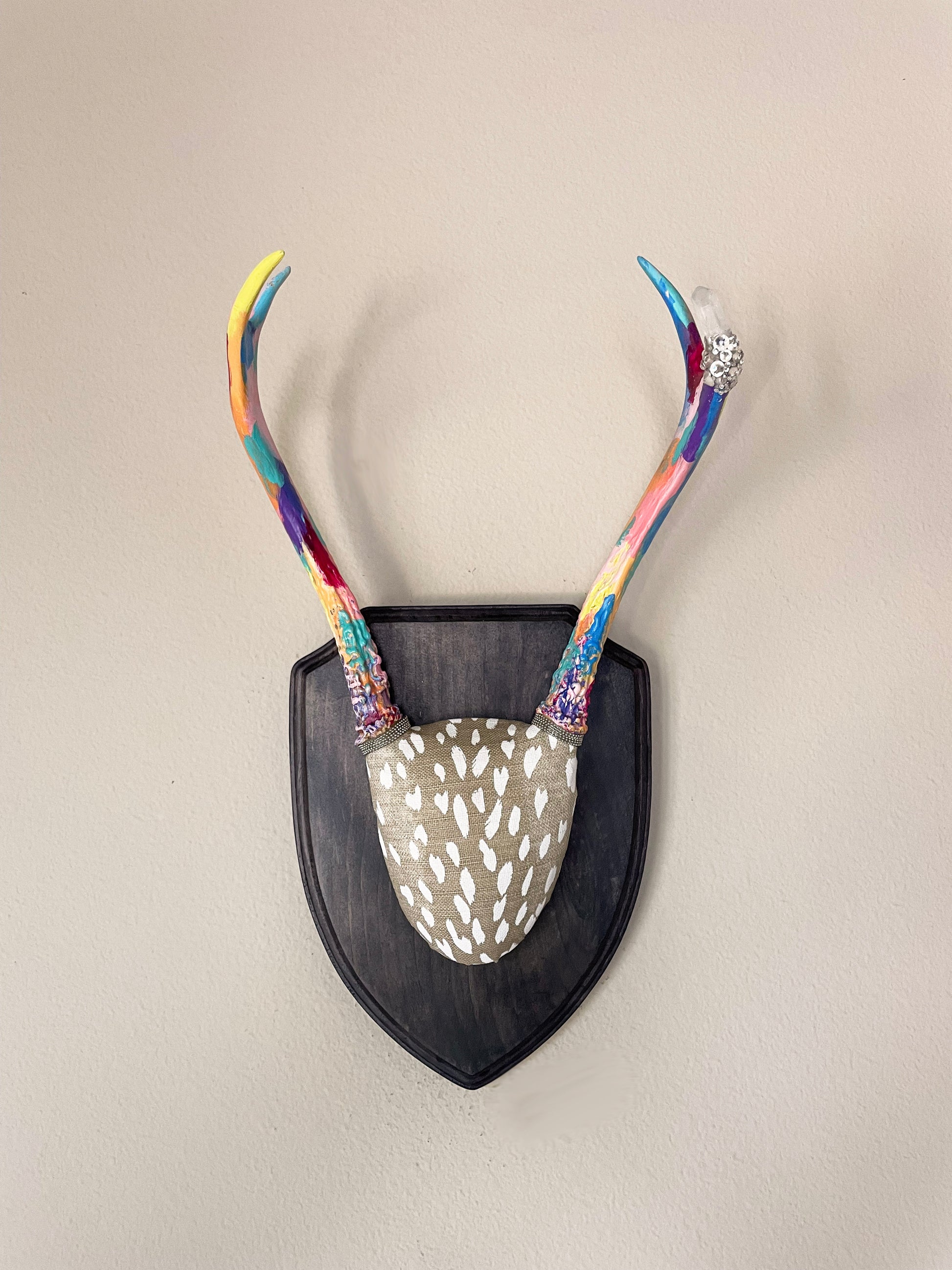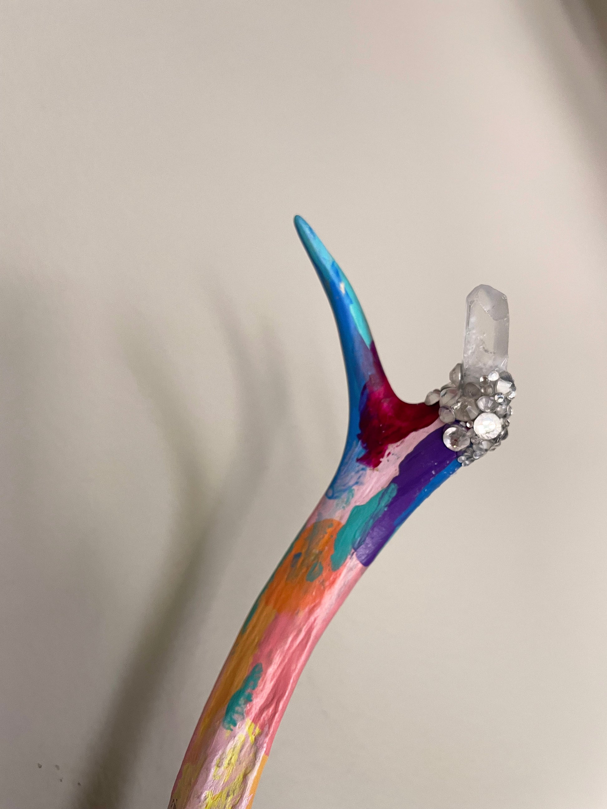 This is a sweet little set with a broken point which has been "repaired" with a quartz point and rhinestones. The colors are bright and beautiful. It's small in size but big in drama.