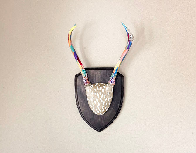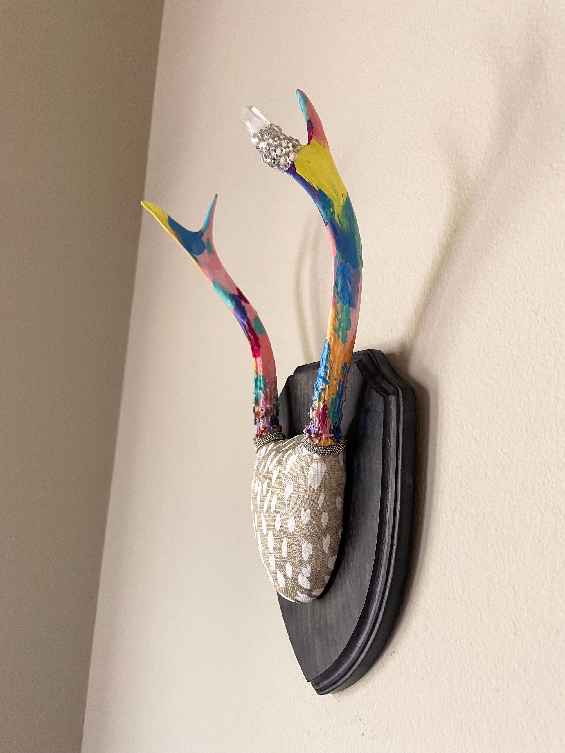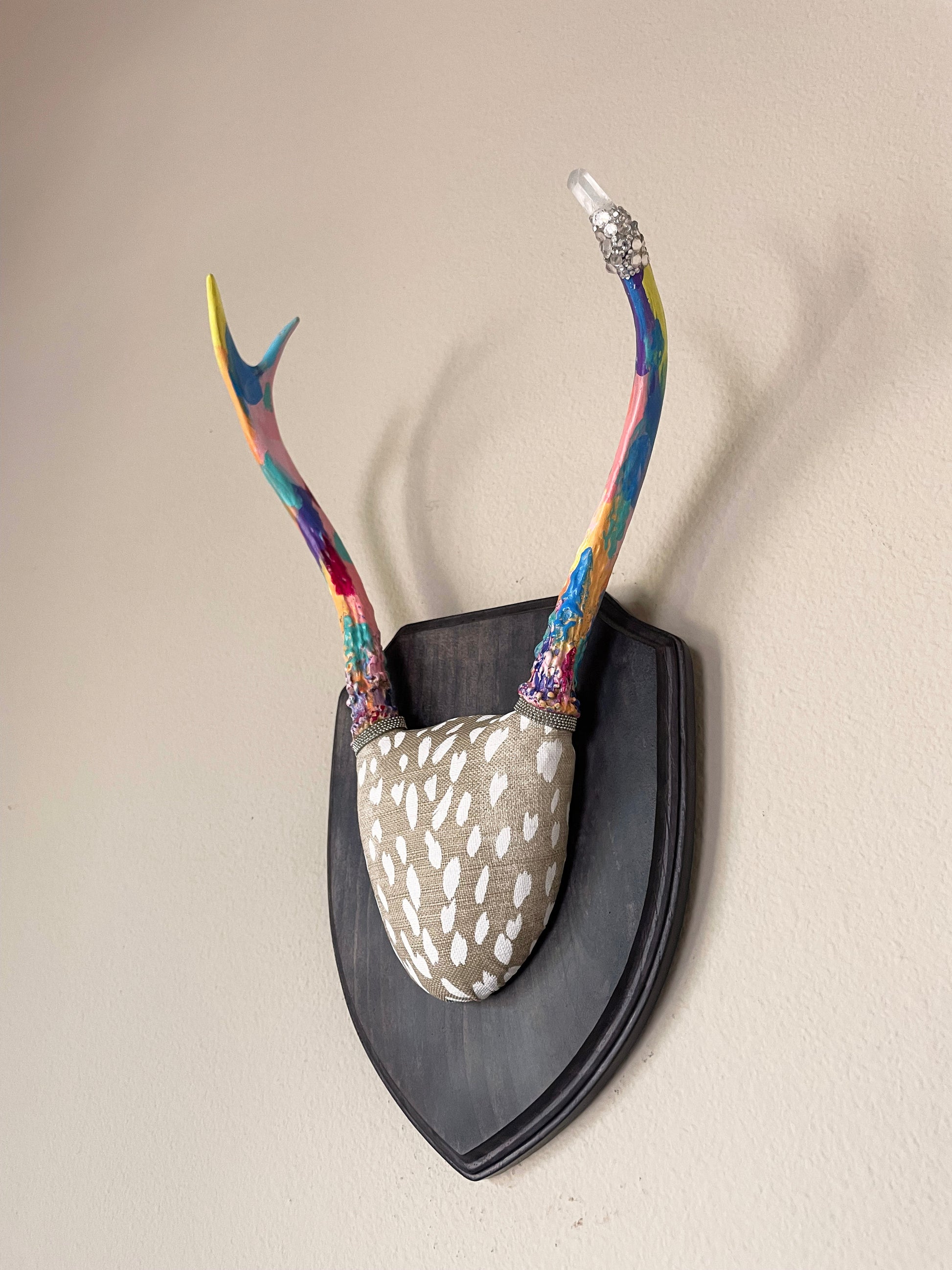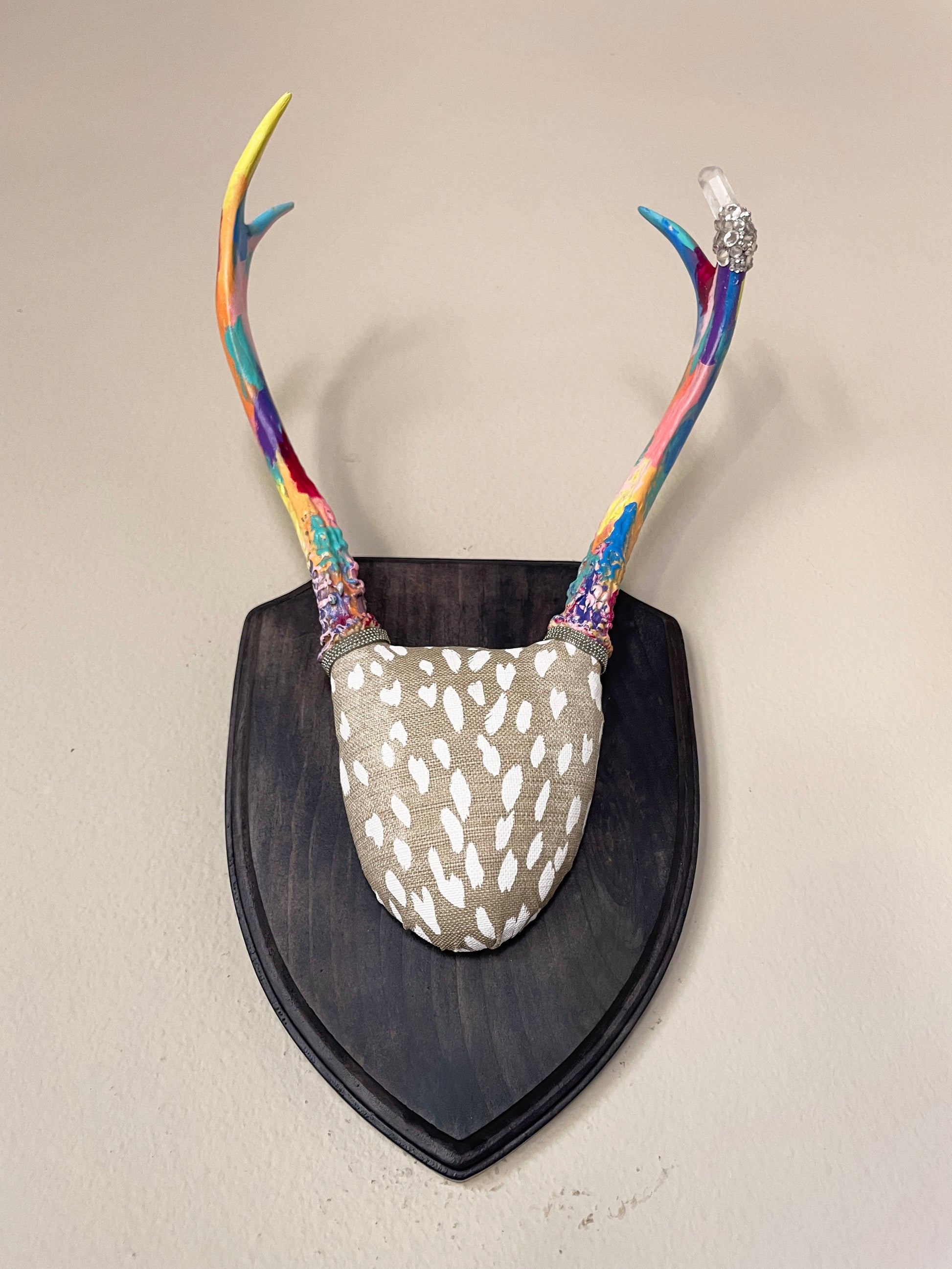 This is a sweet little set with a broken point which has been "repaired" with a quartz point and rhinestones. The colors are bright and beautiful. It's small in size but big in drama.