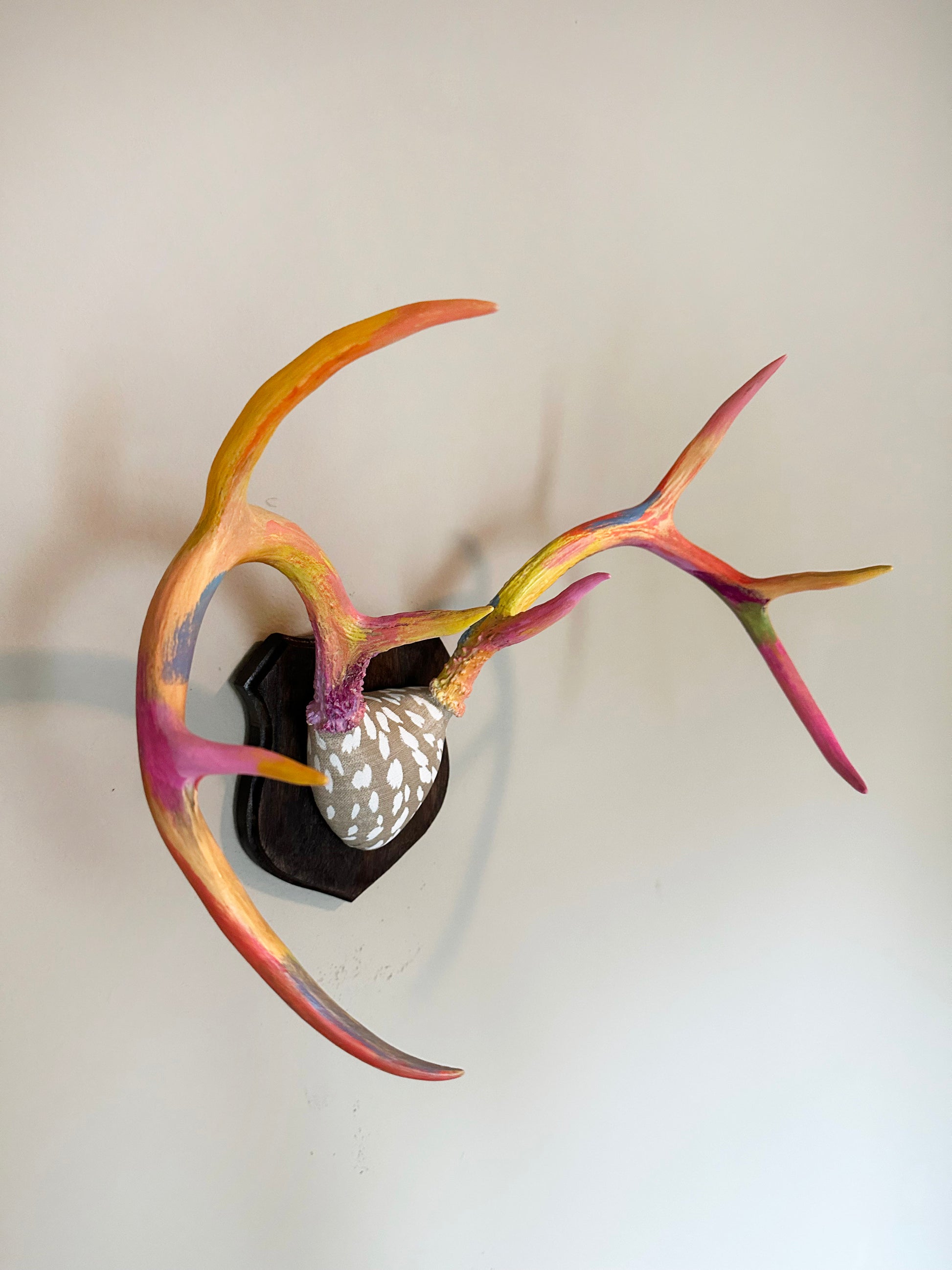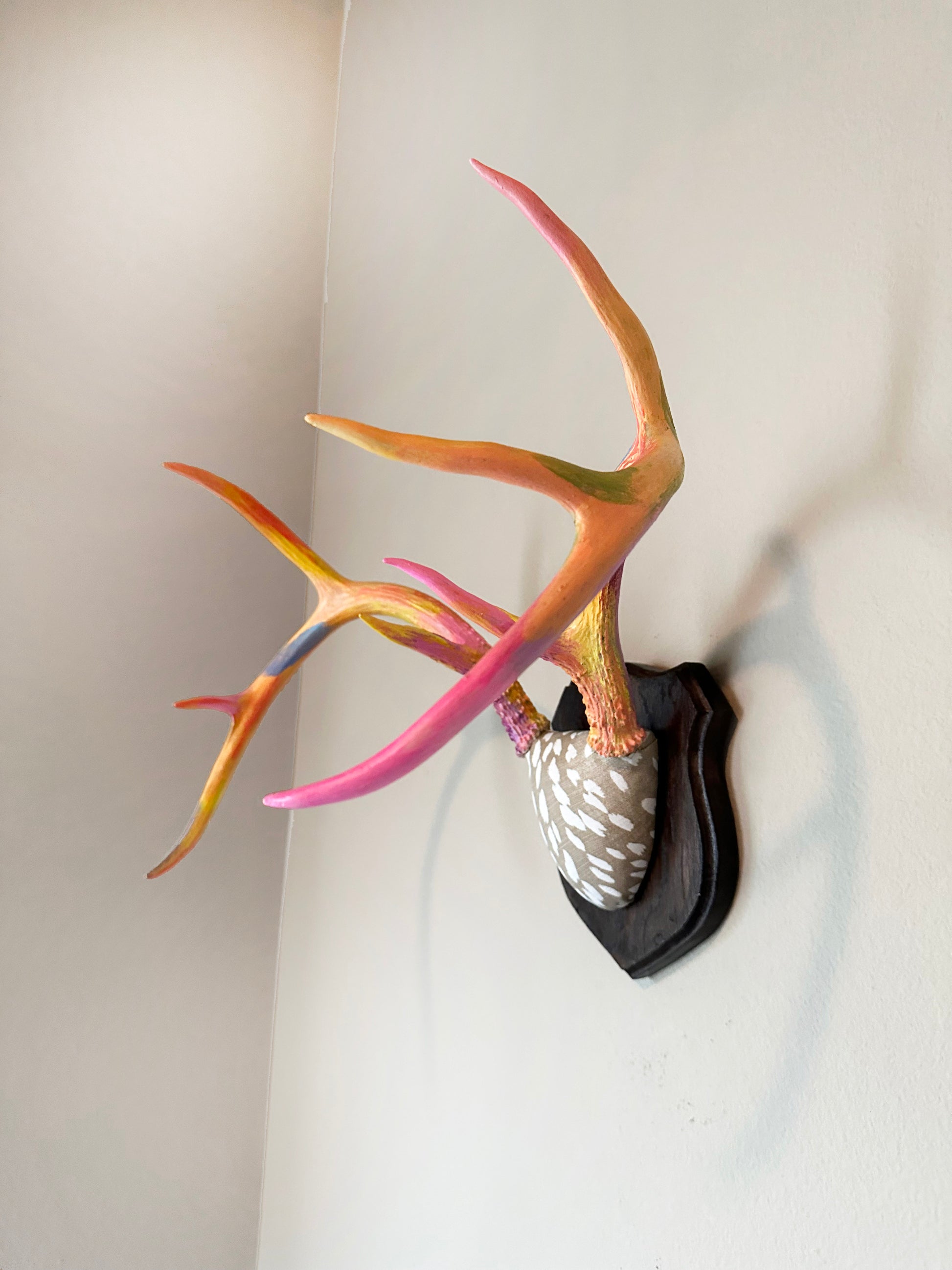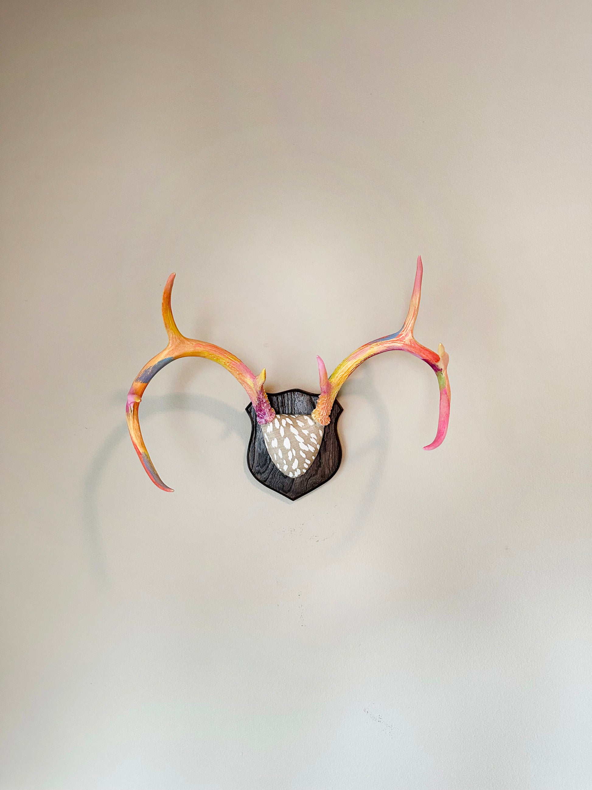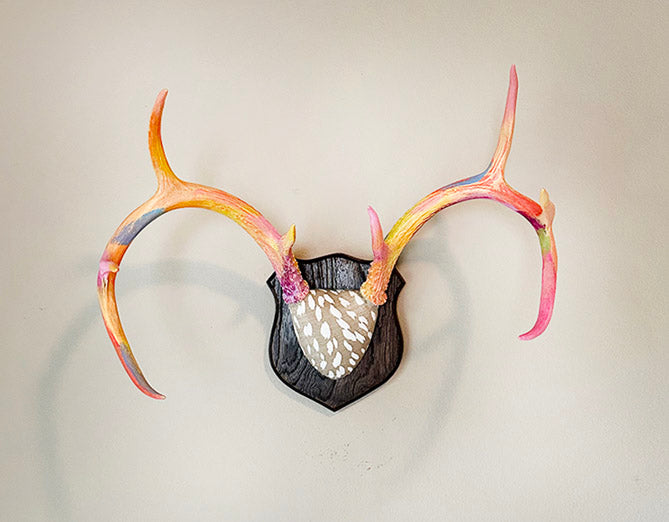 Beautiful set of whitetail deer antlers painted in bright whimsical colors and mounted on a solid maple plaque.