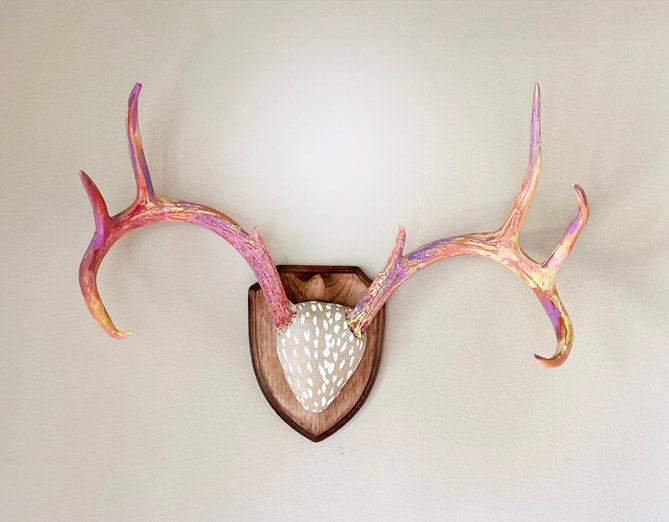 Super large set of beautiful real whitetail deer antlers hand painted in pink and yellow hues, covered in fabric and mounted on a stained wood plaque. This piece is large and majestic and comes ready to hang.