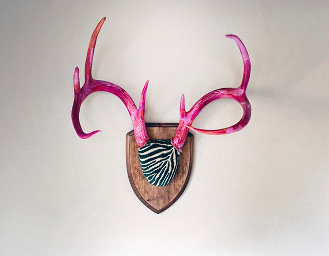 Stunning symmetrical 8 point whitetail deer antlers mounted on wooden plaque and ready to hang. I've named this piece Viva Magenta as it was inspired by the Pantone color of the year for 2023. It's whimsical, beautiful and the perfect size to make a statement in any room.