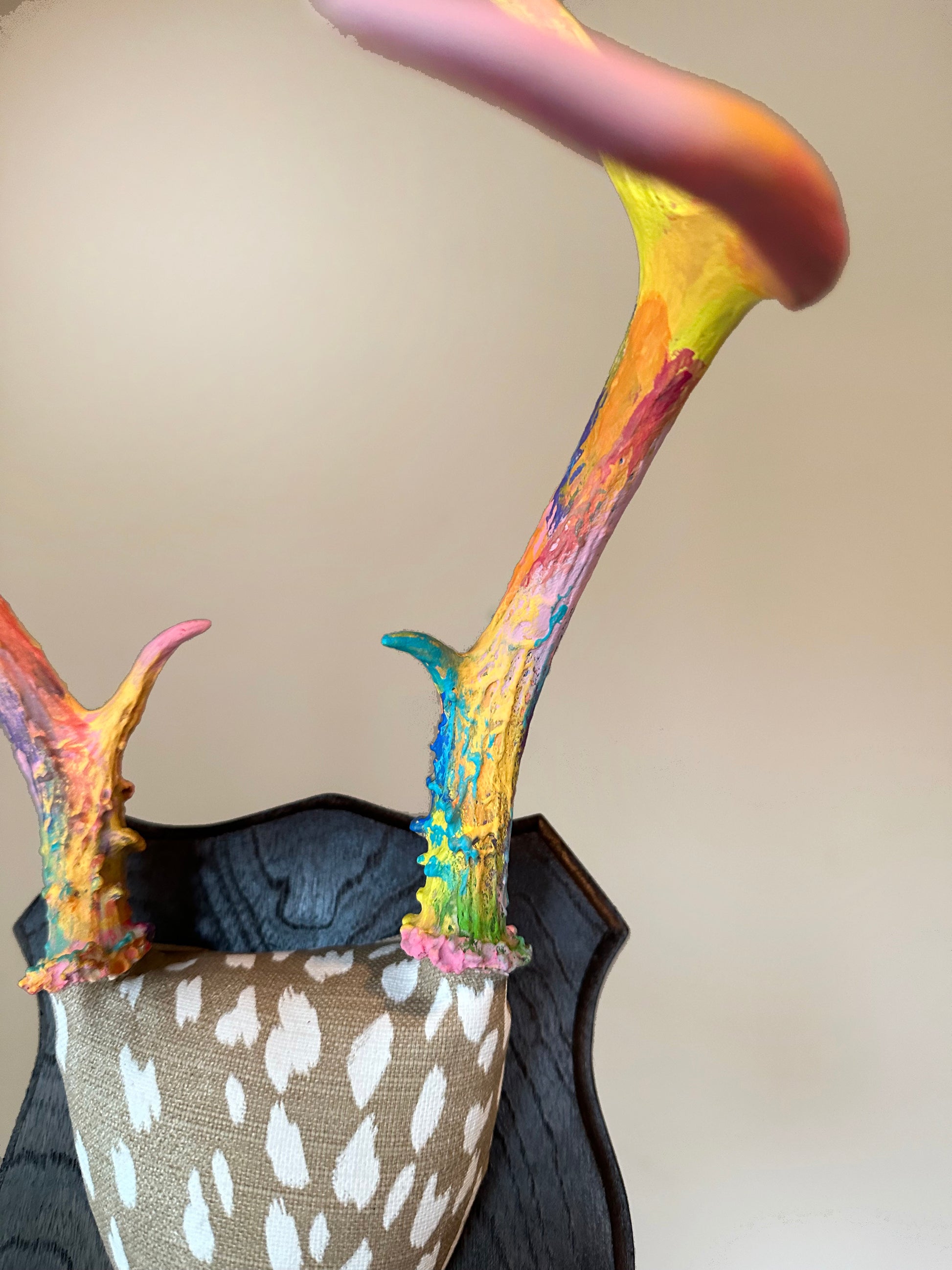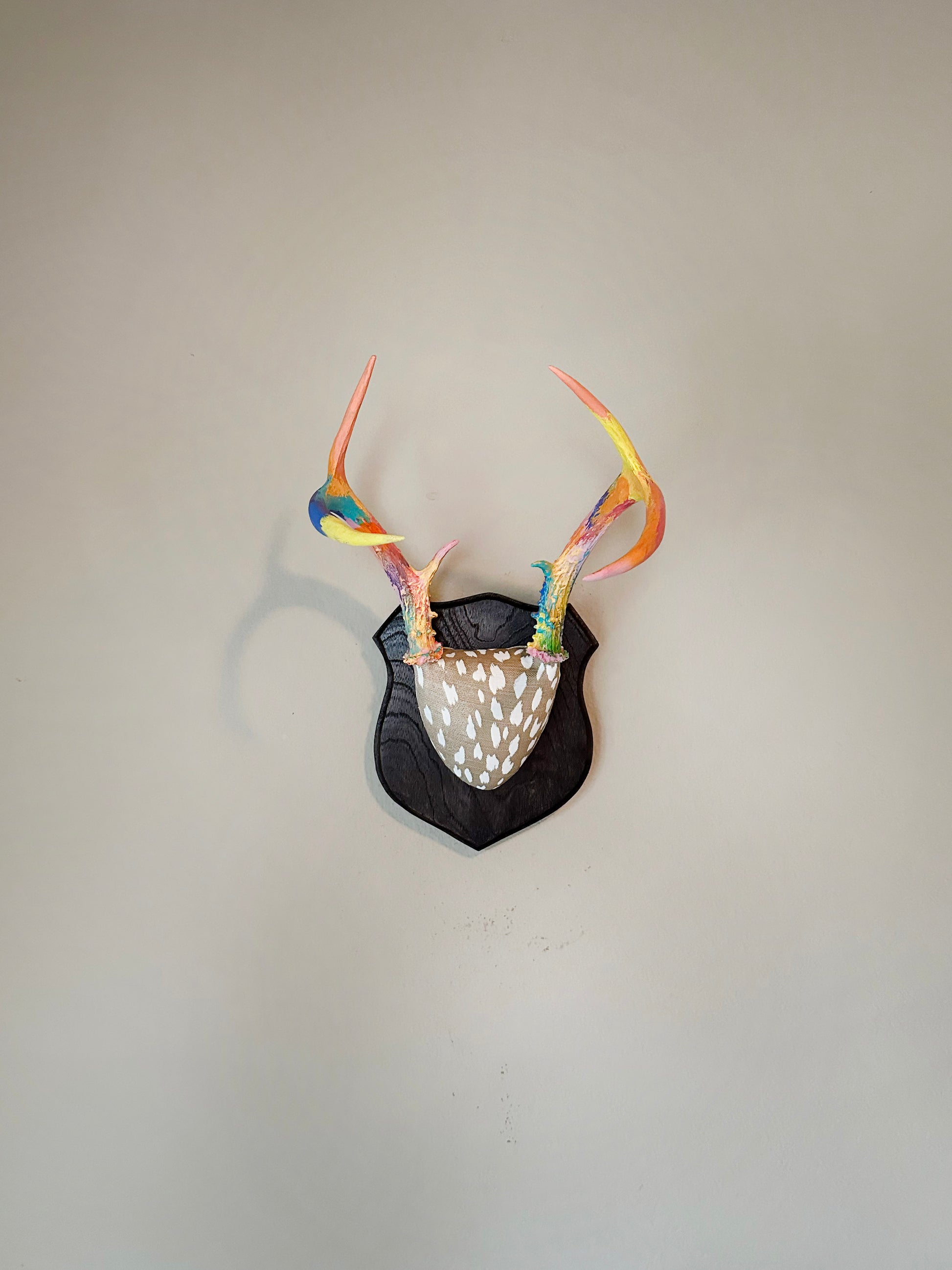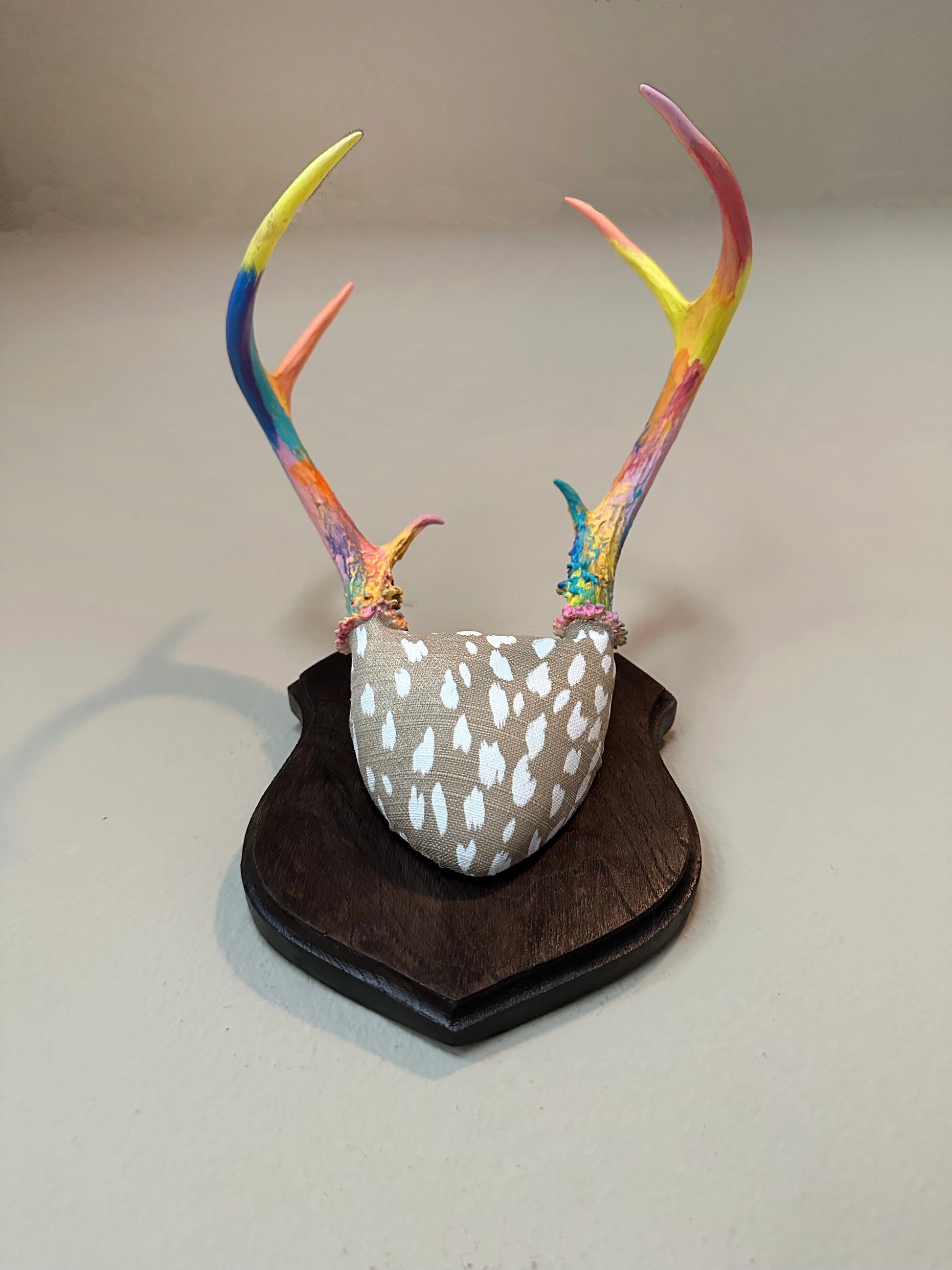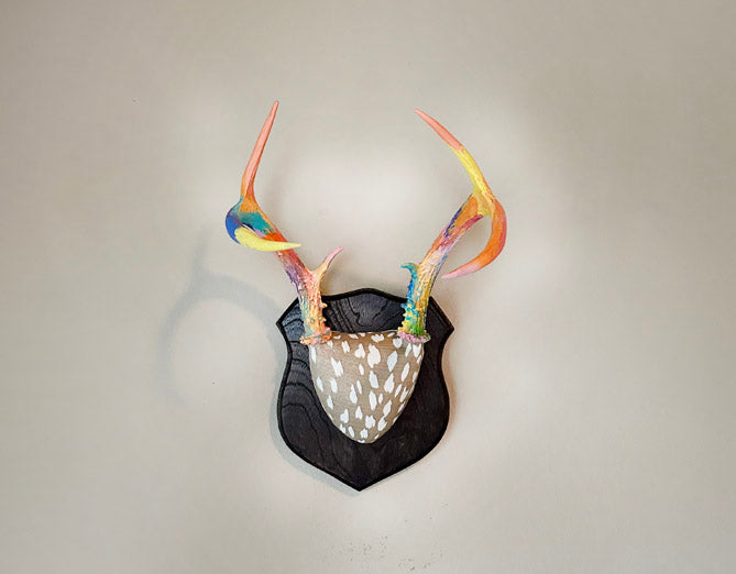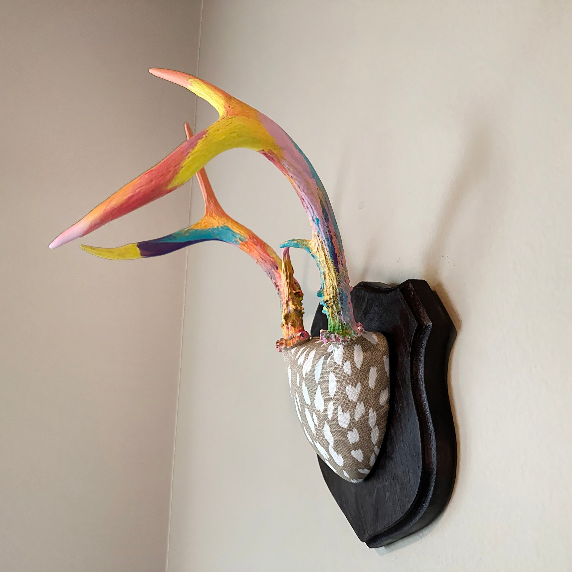 Let this small set steal the show in your favorite room. These are a rare find and I had so much fun painting and mounting them. They are colorful and bright like a rainbow and mounted on a solid wood stained and painted plaque. This small set is bright and cheery with all the flair of a large rack but small enough to fit anywhere.